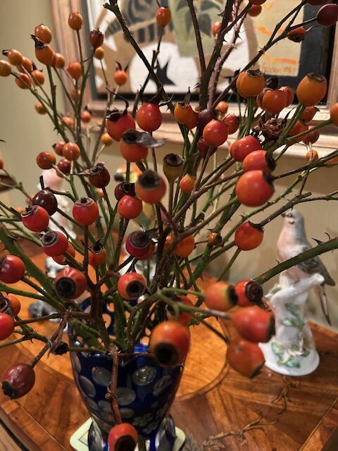 Our NGS open days will soon be upon us Saturday and Sunday 7th and 8th February 11 – 3.30 so we are working hard to make ready. in the course of pruning the lovely rose Rosenstadt Freisling i couldn’t bear to throw the wonderful hips away so put them in a vase.