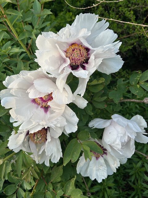 Now in late April the peonies are joining the show, again they are very early. The one I always look forward to seeing is my own seedling from P. Gansu hybrid (sorry to boast but I am really proud of them). Several from the batch flourished and now nearly ten years later are substantial plants. One in particular is closest to the wild species known as P. rockii. Huge white flowers stained purple at the centre are spectacular in bloom. Another has pink petals with purple centres which are still remarkably beautiful. Alas these mouth watering flowers last only a few days but are a good reason never to be away from the garden at this time of year.